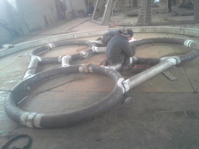 這種結構形式的缺點是耐熱混凝土整體澆筑后難以改變工藝參數;在使用中發現,由于骨架漏水,該結構的熱停爐時間較長(占所有熱停爐時間的50%~86%);耐火混凝土層長期使用后會脫落;煙罩對地絕緣性差,容易漏電。因此,在實踐中有許多改進。由于骨架是整個爐蓋的關鍵部位,需要足夠的剛度、強度、抗磁性和絕緣性能,部分廠家將骨架設計為“中心凸骨架”,即保持骨架水圈、加料圈、水冷支管連接在同一平面上,將三個電極孔圈和中心管孔圈提高一定高度(超過原平面50~100mm),形成中心突出的連接方式。