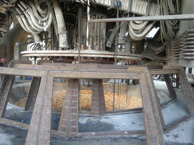 礦熱爐設備的柱子和底板直接壓在絕緣板表面,“坐”在地板土建環梁上。耐火混凝土層采用高耐火鋁鉻渣為骨料,整體澆筑,保護整個頂蓋骨架。支架由空心鋼柱和回水管組成,不僅支撐低煙罩的重量,而且形成操作門和側墻的框架。側墻一般采用耐火磚,操作門在電極表面打開。排煙孔根據爐蓋和側墻的位置設置,分別與煙囪或爐氣除塵回收設備連接。根據實際情況,在爐蓋上方設置煙道孔和進料管口。該結構具有耐火性好、抗變形、承載強度高、功耗低、投資節省、使用壽命長等優點。