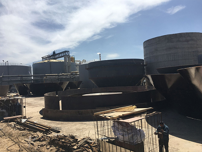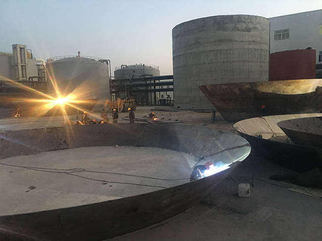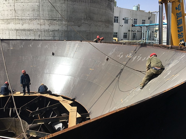 在離子膜堿生產中,一次性鹽水的精制過程非常重要。目前,國內氯堿企業大多采用預處理澄清與膜過濾分離相結合的技術,一次性完成鹽水固液分離,獲得幾乎不含固體的澄清鹽水。粗鹽水預處理器是鹽水精制過程中的關鍵設備。粗鹽水預處理器生產廠家寧夏程達動力使用的預處理器形狀為上圓錐形和下圓錐形,大直徑為15.5m,質量260t,大容積1920m3,安裝在高度11.0m的基礎上,是典型的高空組裝大型非標準設備。粗鹽水預處理器的生產和安裝對后續設備的正常使用起著決定性的作用。